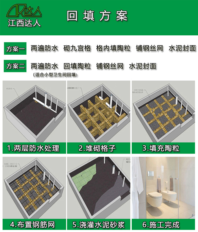 4. 箱回填約4/5時(shí),用水泥沙漿找平約30mm-60mm,要壓實(shí).如放置浴缸處必須加φ6鋼筋做成20cm方格狀.